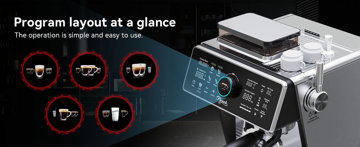 The large TFT screen clearly shows brewing temperature, pressure, and extraction status in real time. Intuitive knob navigation makes it simple for beginners while giving coffee lovers full control to fine-tune every shot.