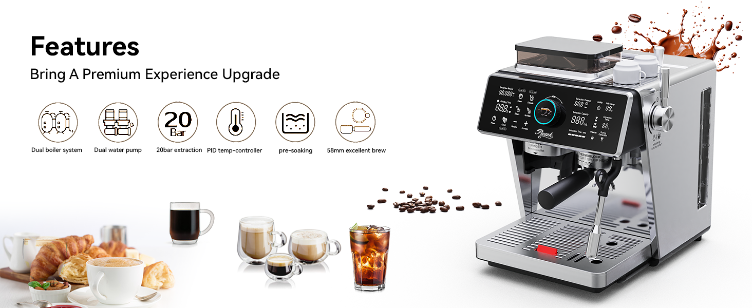 PwZzk Dual Boiler Espresso Machine with Grinder & Steam Wand – Smart TFT Display, 58mm Portafilter, Professional Home Coffee Maker