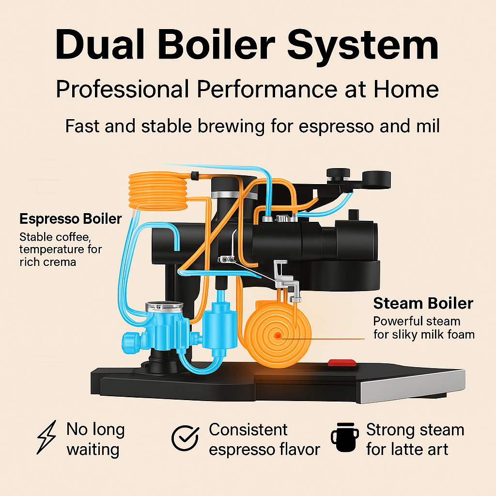 Dual stainless steel boilers deliver stable temperature and optimal 9–10 bar extraction pressure while steaming milk at the same time. Enjoy rich crema and faster back-to-back drinks without long waiting.